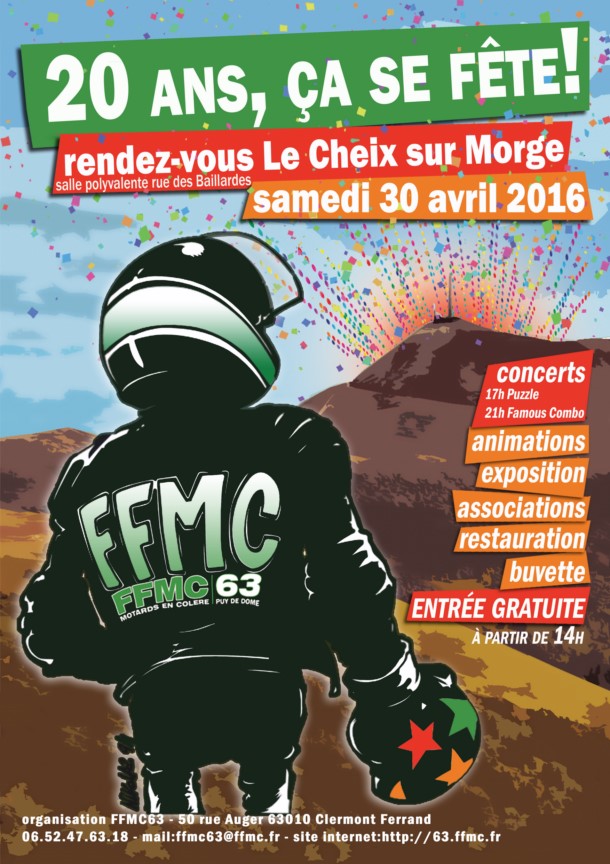 SAMEDI 30 AVRIL, la FFMC 63 fête ses 20 ans à la salle polyvalente, rue des Baillardes au CHEIX SUR MORGE (63200).