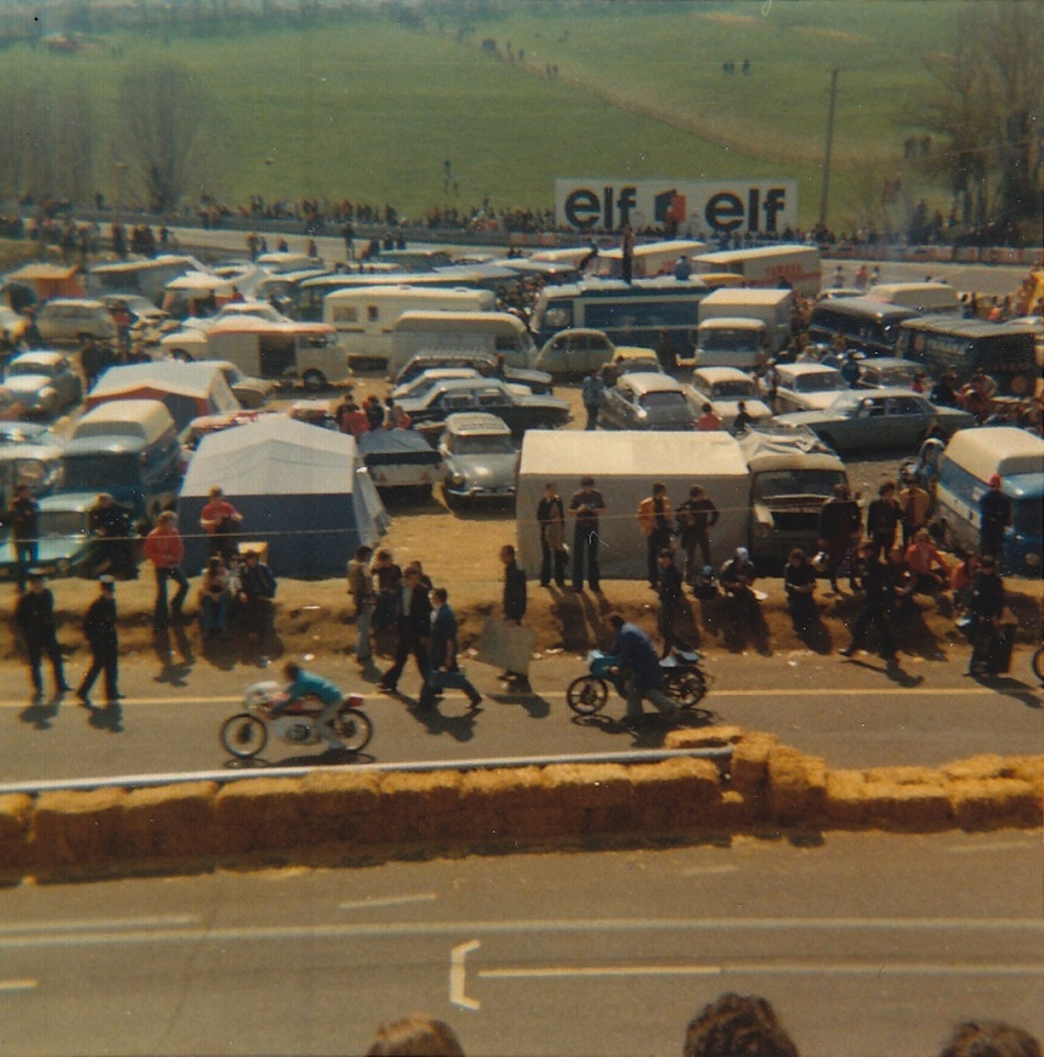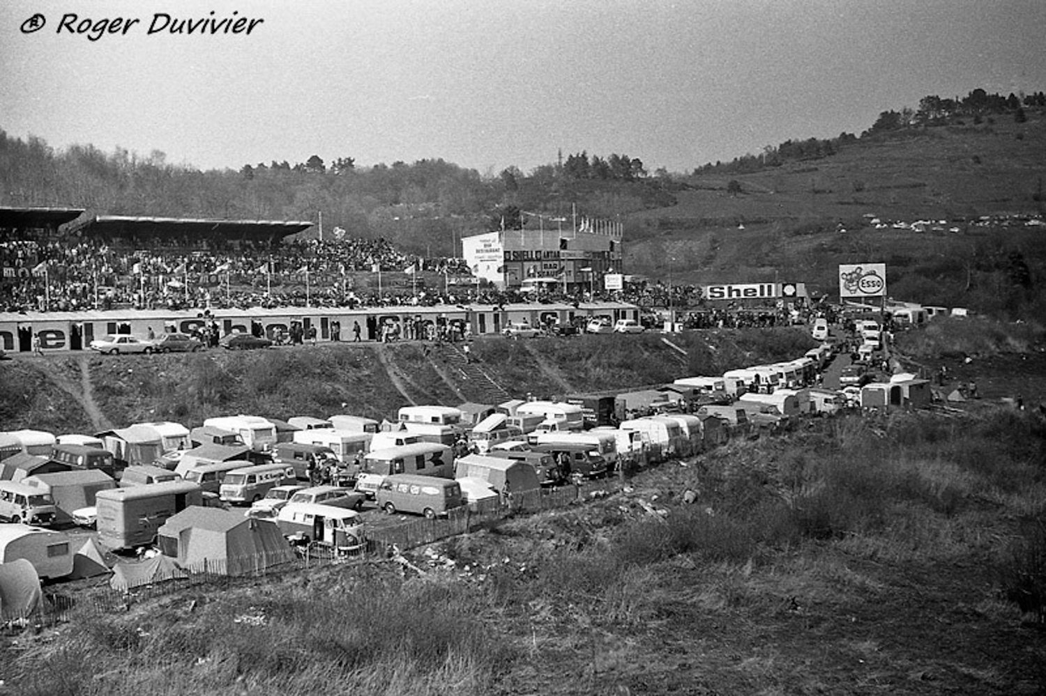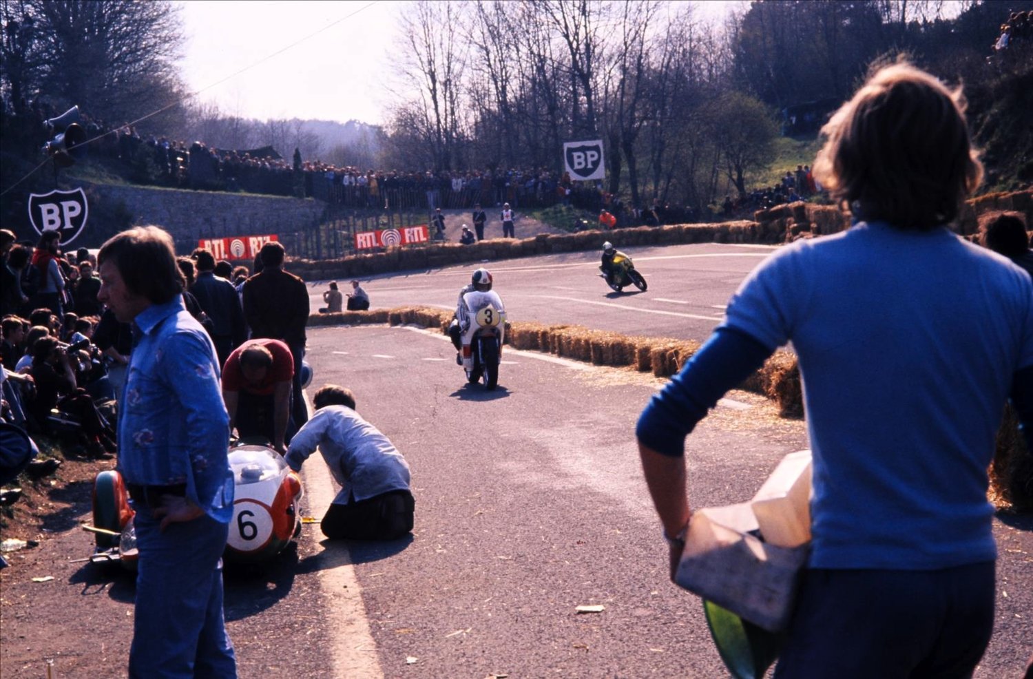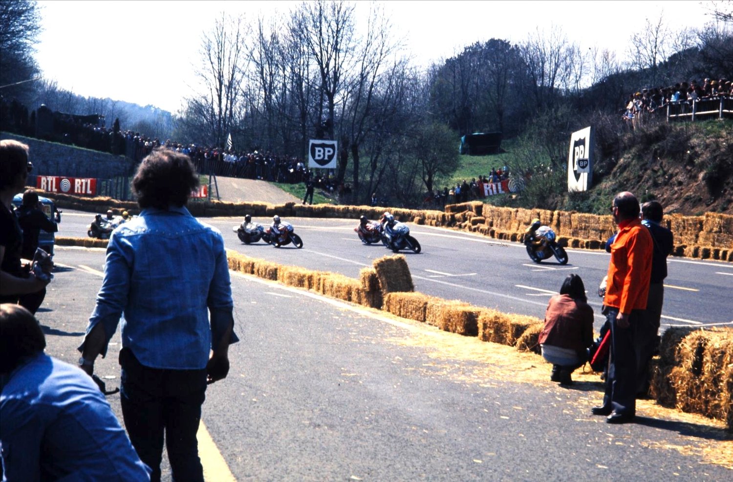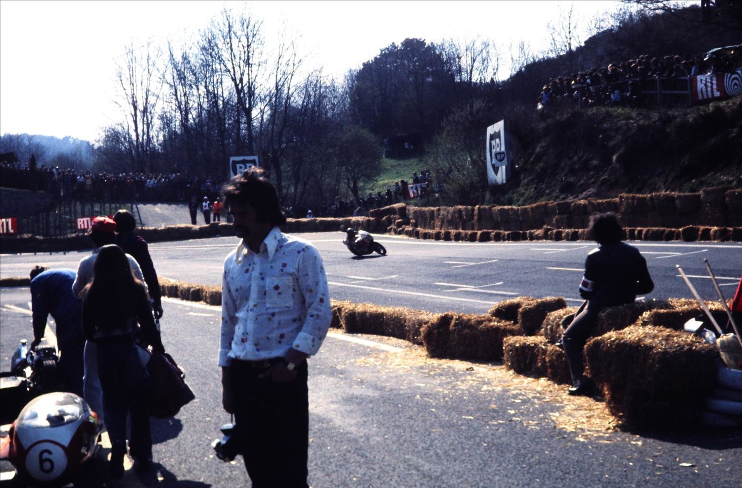 Photos ambiance GP 74, (le public assis sur les rails!) AGO, PONS, BOURGEOIS et Poly coques DROUIHIOLE Bernard. Motos MORACO et SONAUTO.