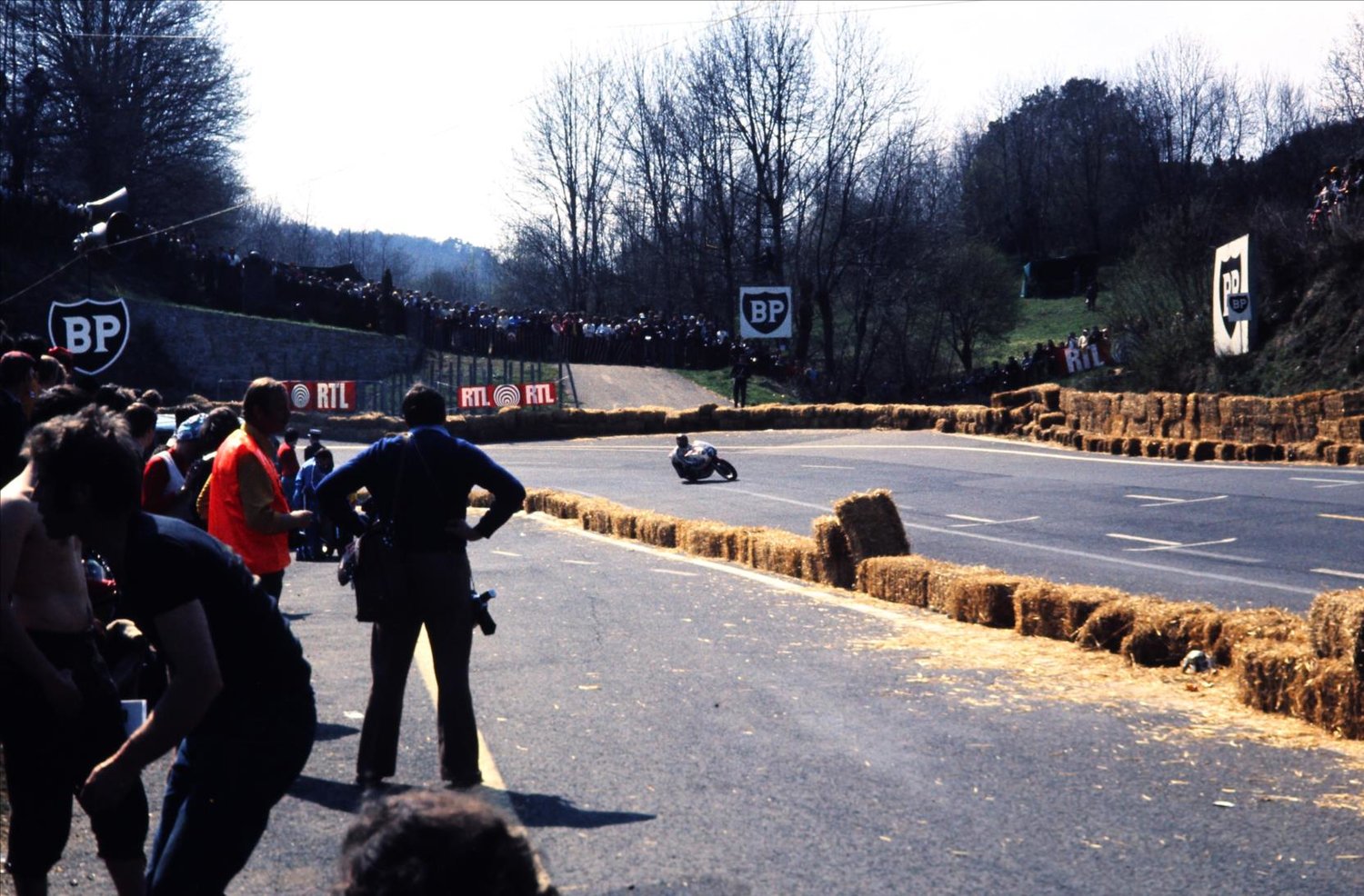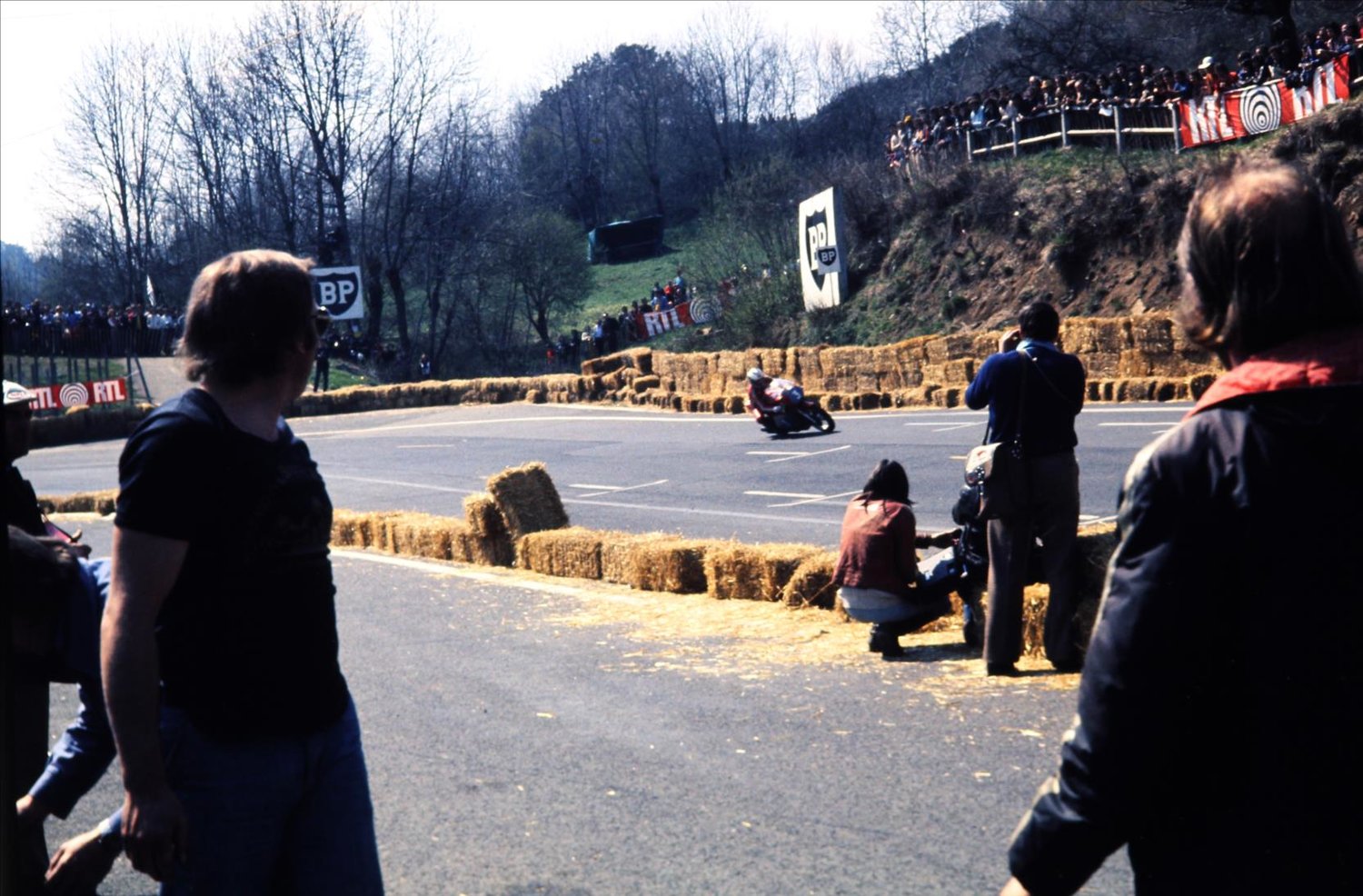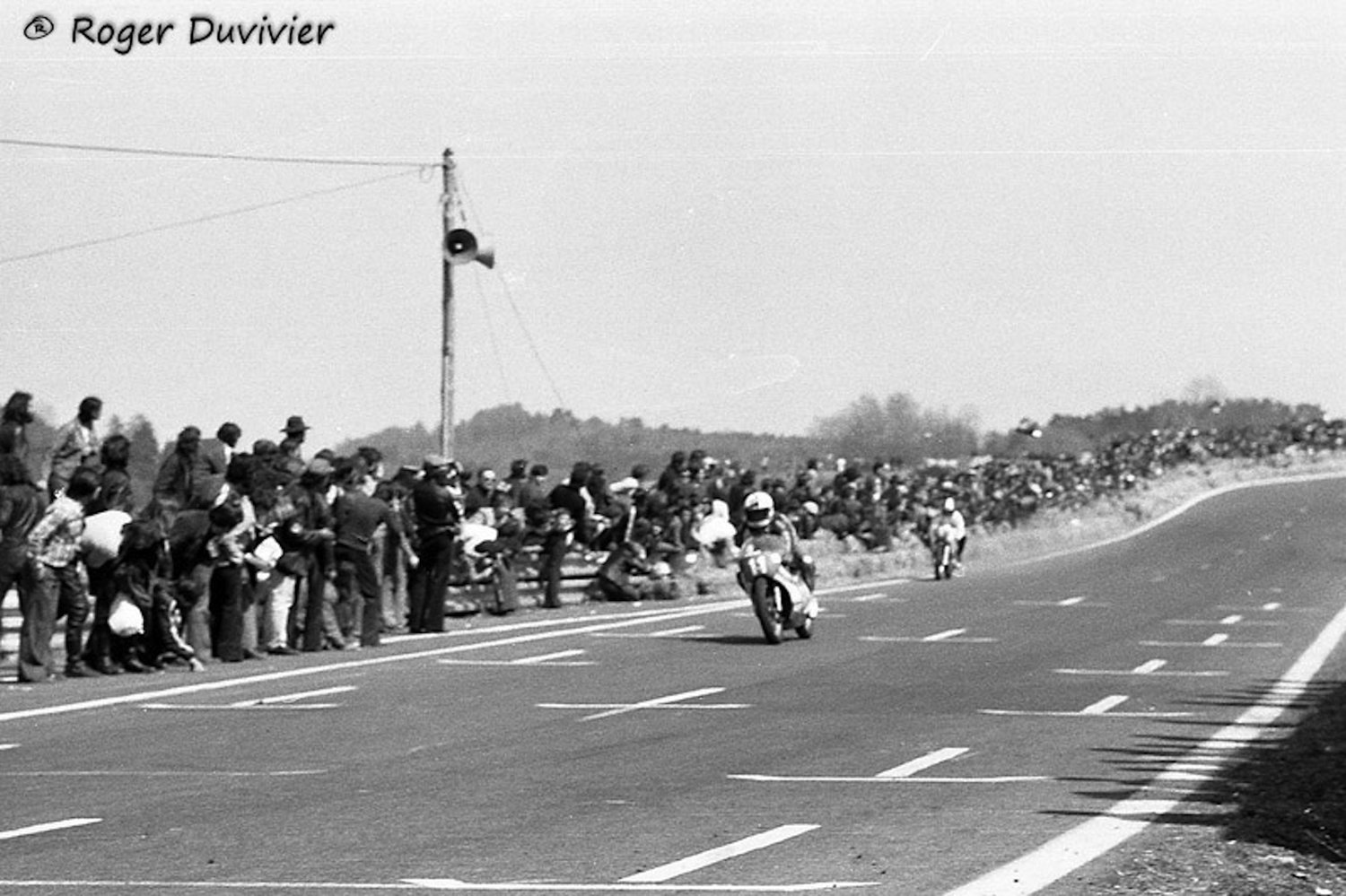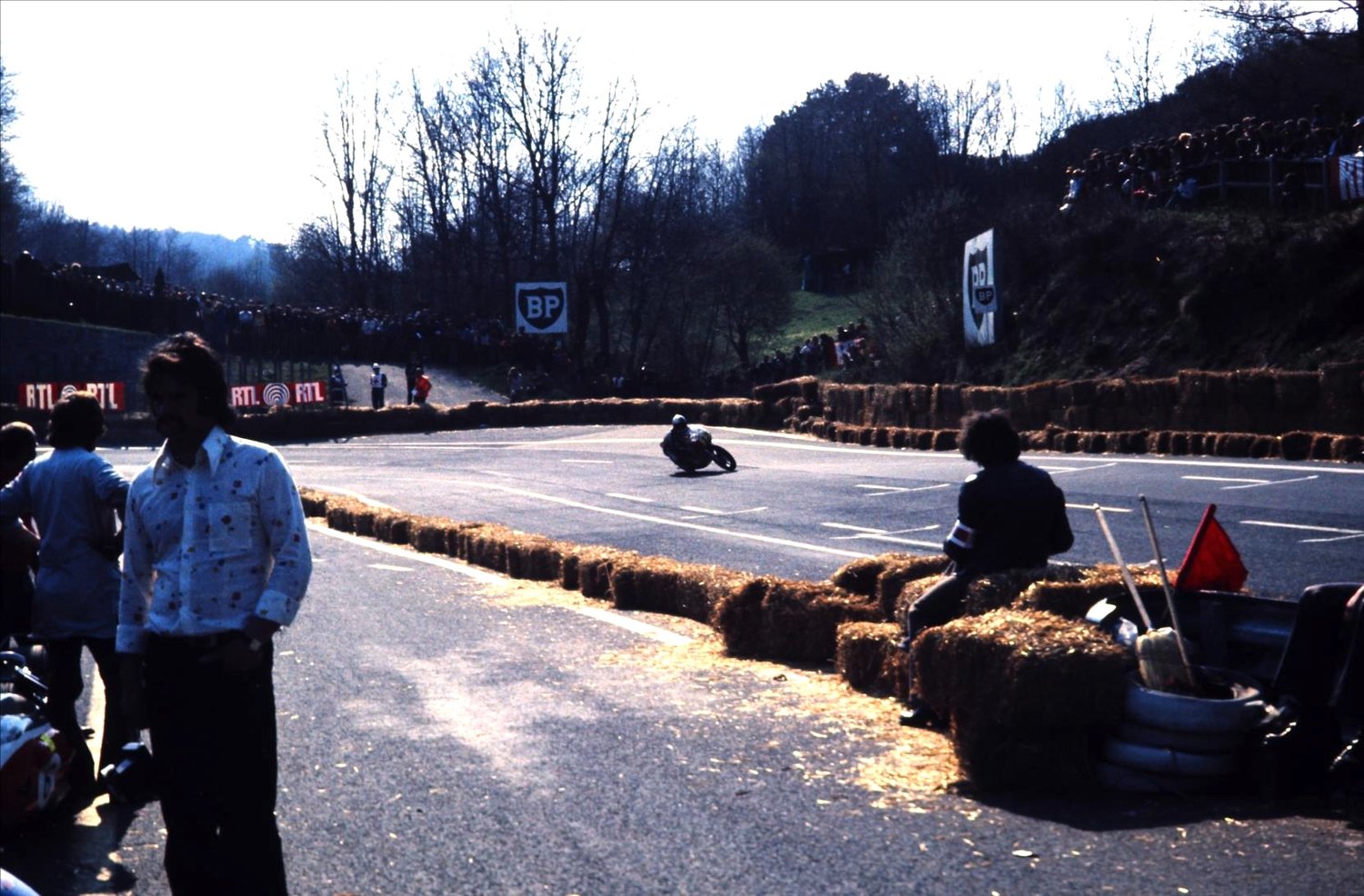 Photos ambiance GP 74, (le public assis sur les rails!) AGO, PONS, BOURGEOIS et Poly coques DROUIHIOLE Bernard. Motos MORACO et SONAUTO.