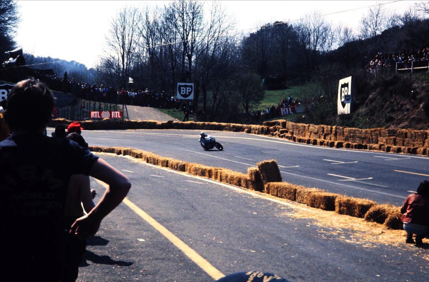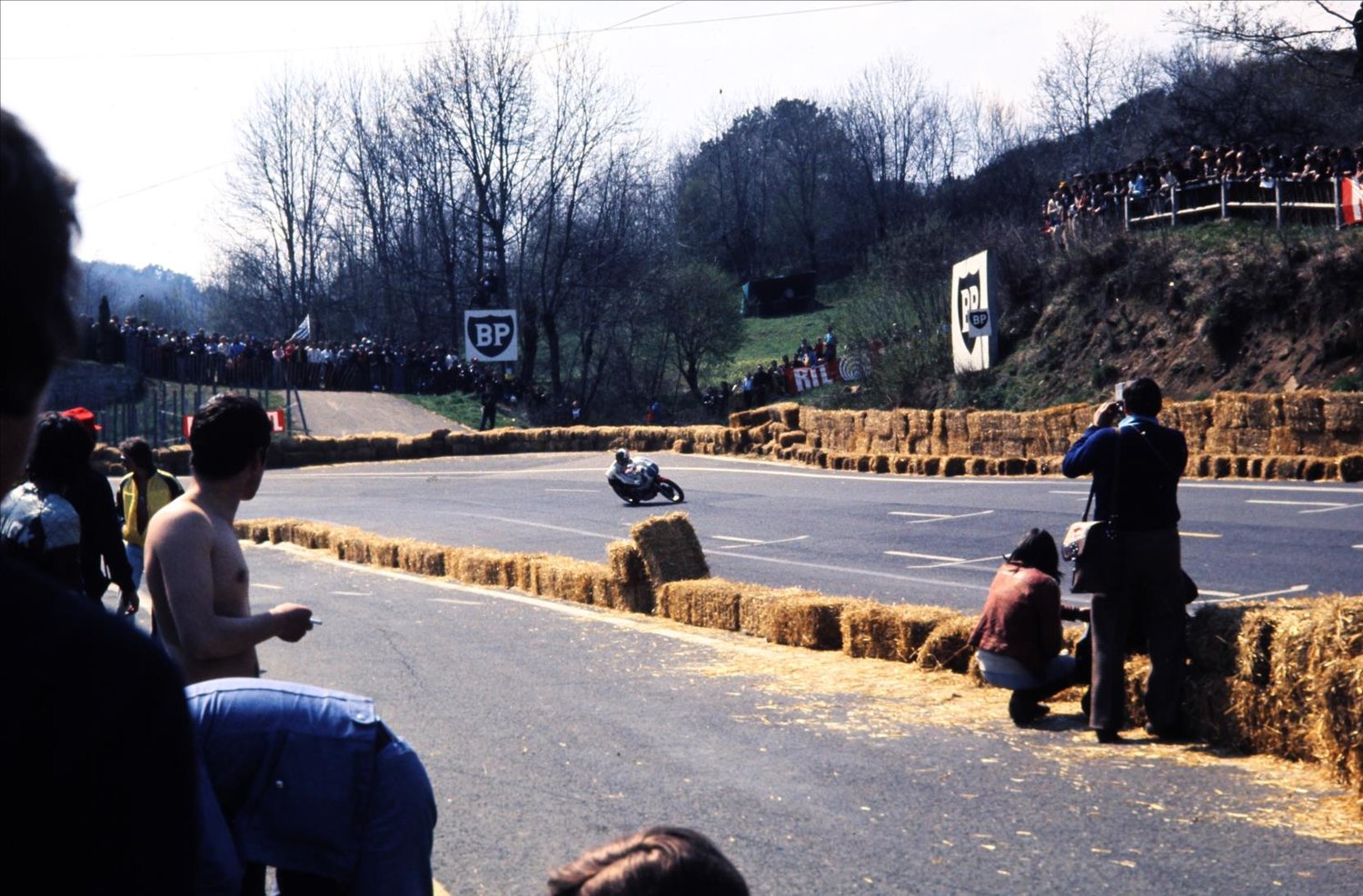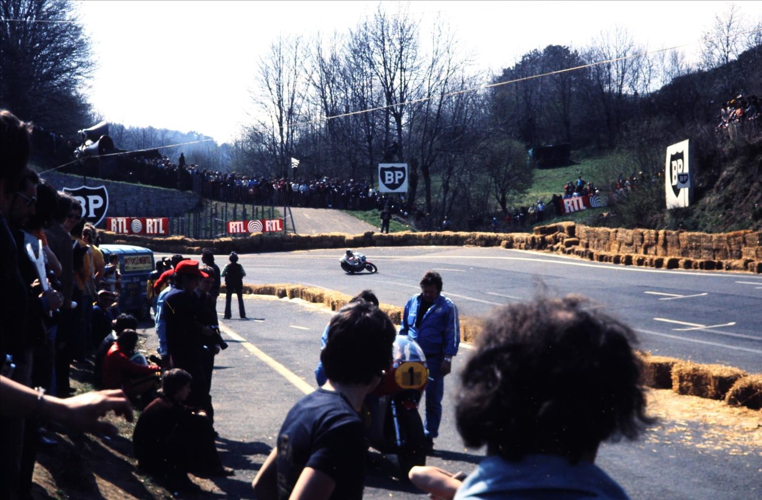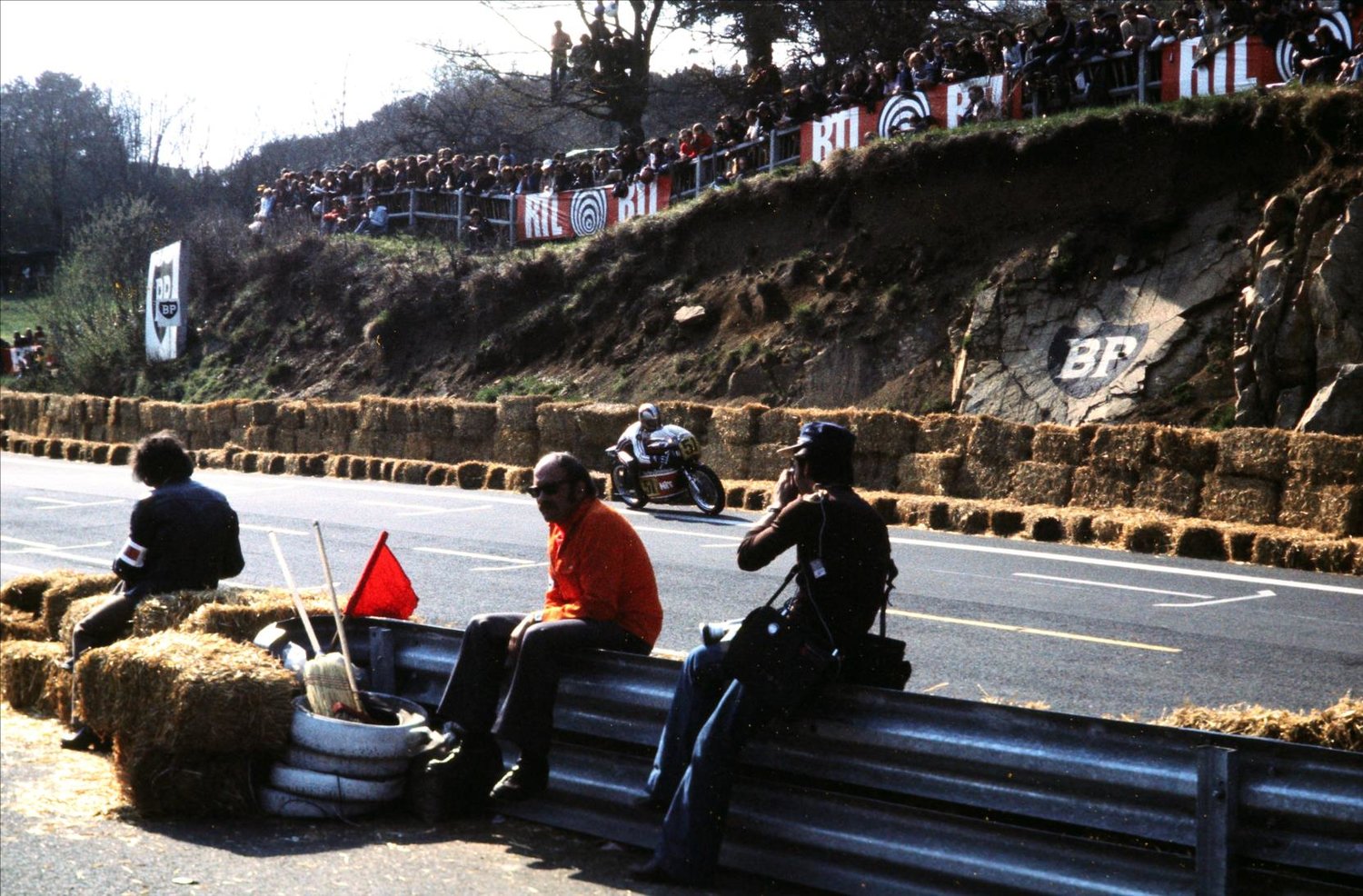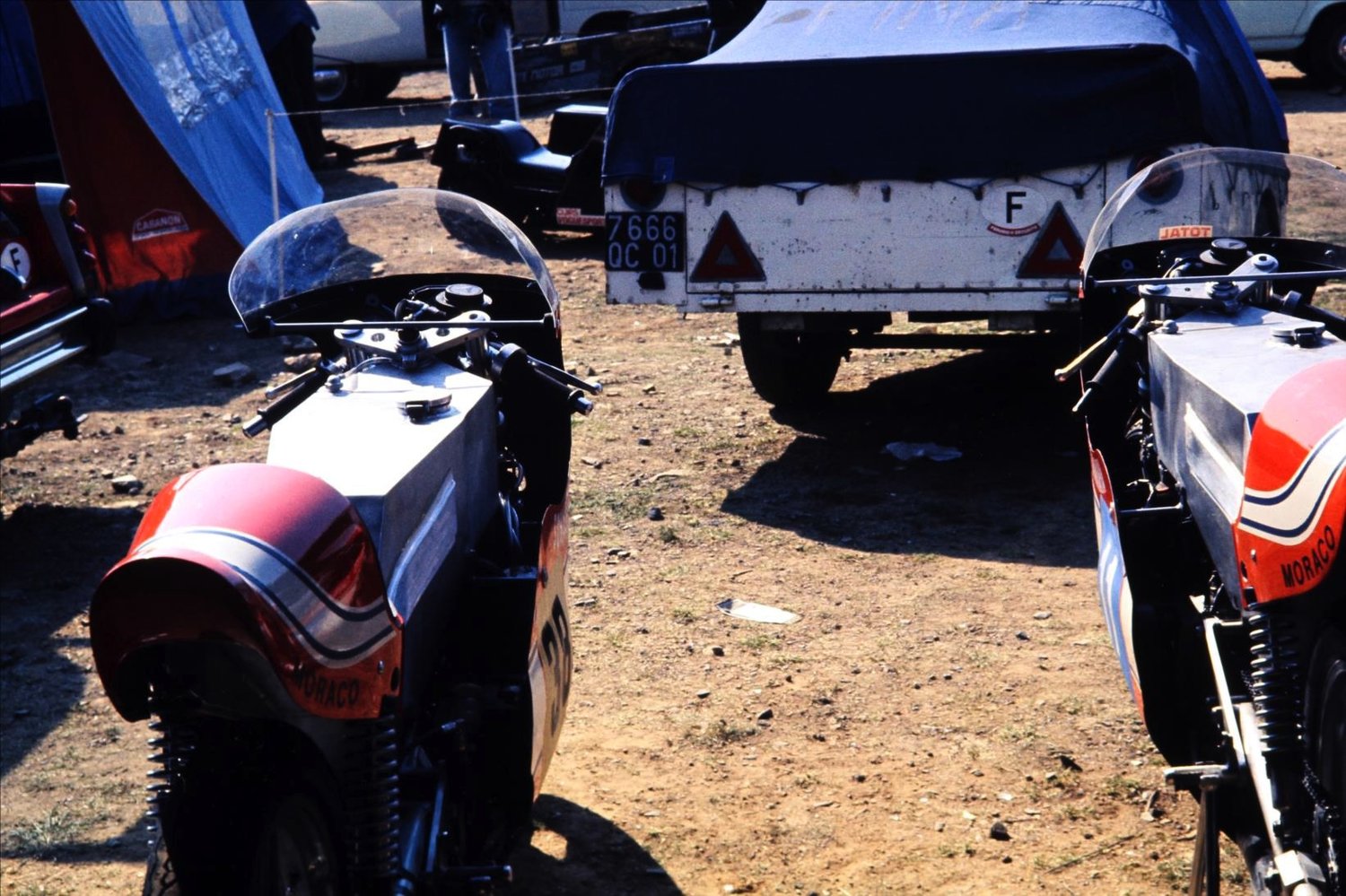 Photos ambiance GP 74, (le public assis sur les rails!) AGO, PONS, BOURGEOIS et Poly coques DROUIHIOLE Bernard. Motos MORACO et SONAUTO.