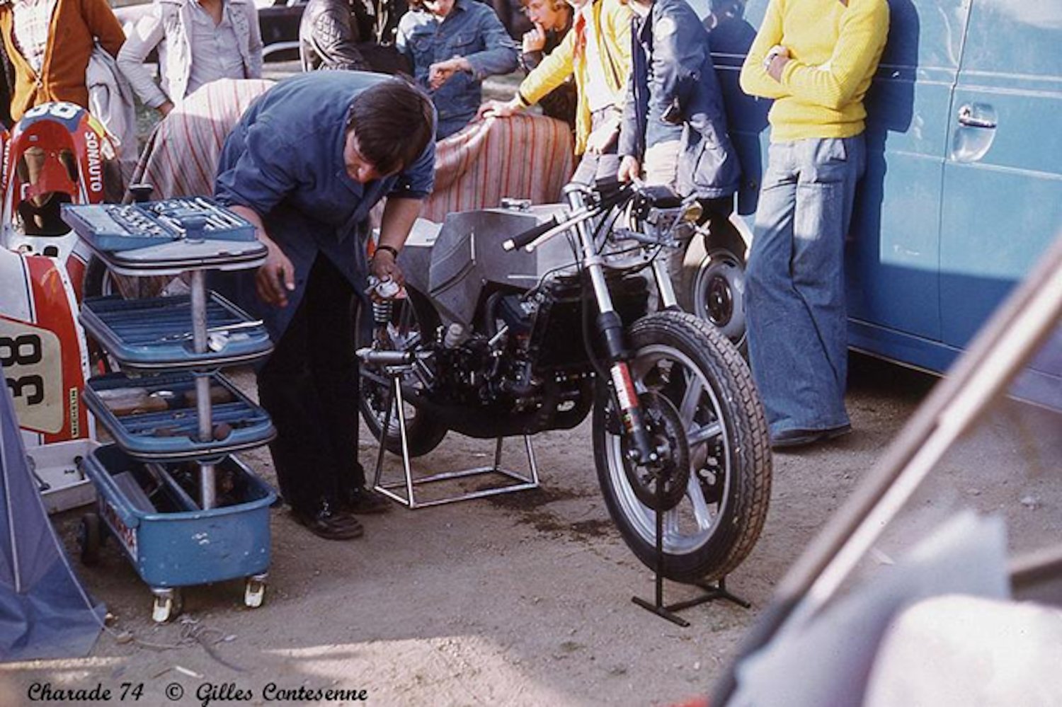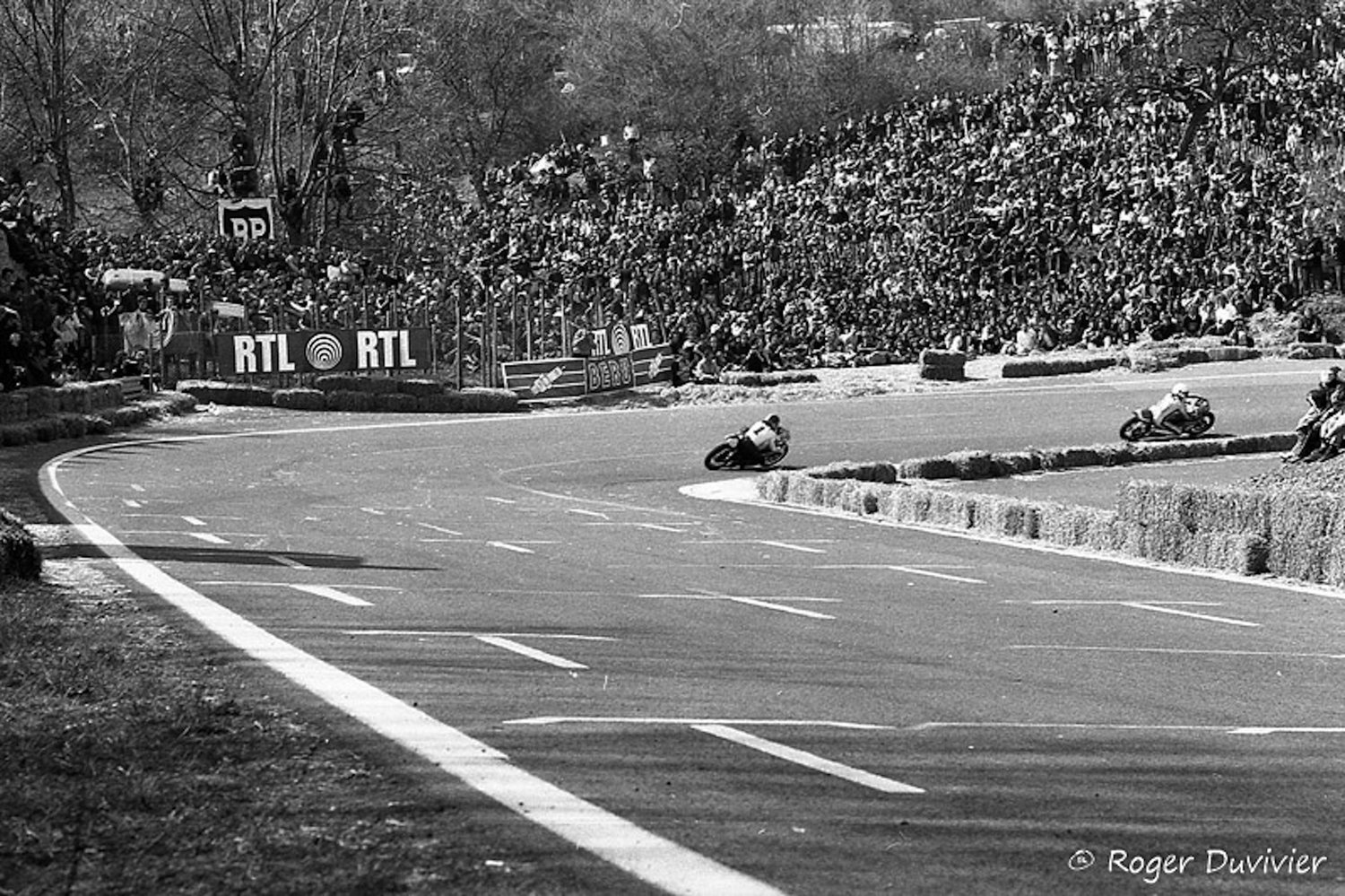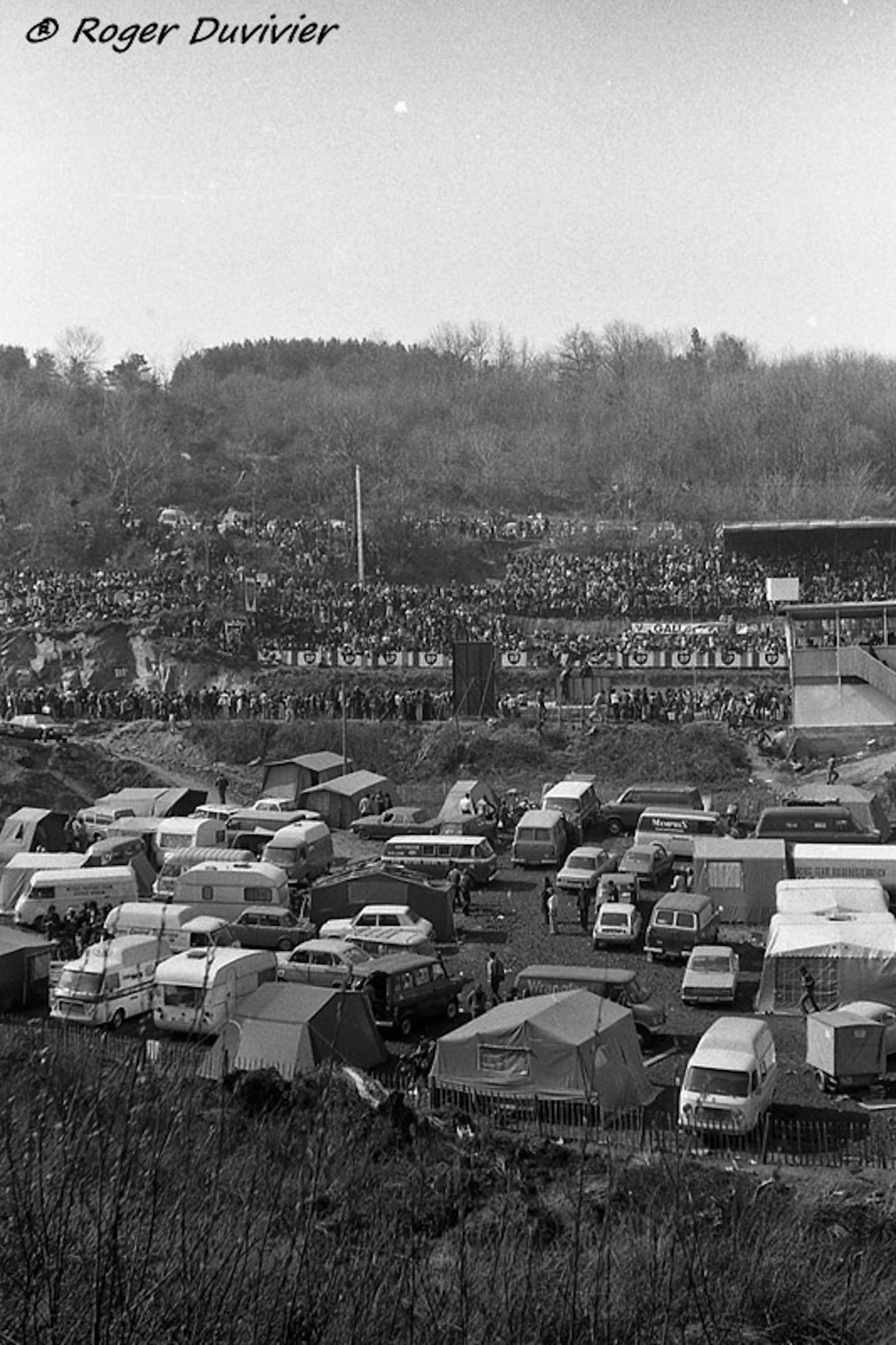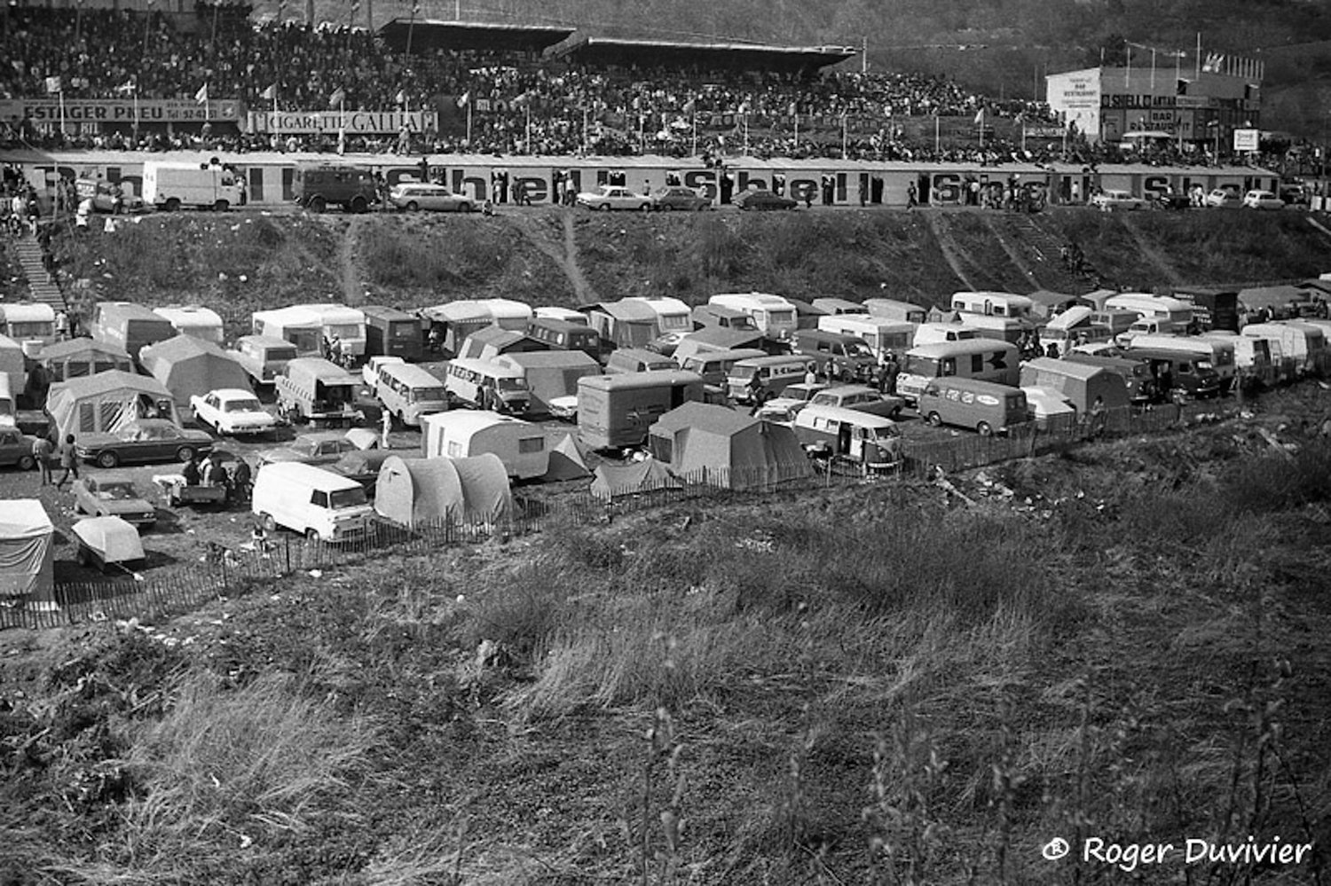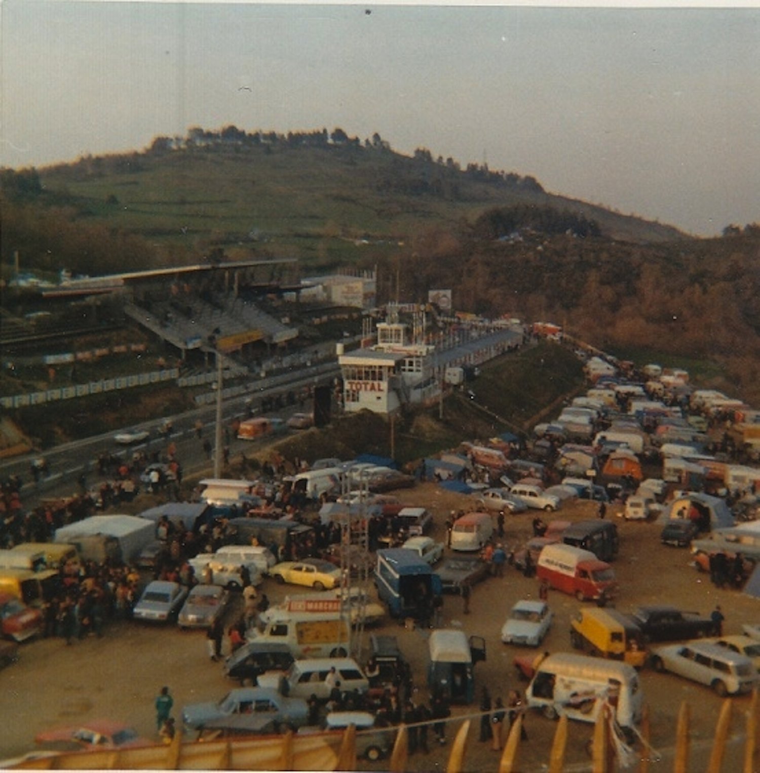 Photos ambiance GP 74, (le public assis sur les rails!) AGO, PONS, BOURGEOIS et Poly coques DROUIHIOLE Bernard. Motos MORACO et SONAUTO.